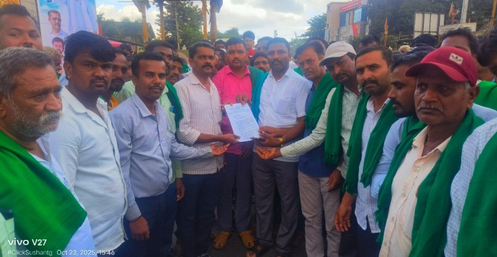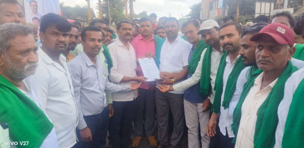 ತಡೆದು ಪ್ರತಿಭಟನೆ ನಡೆಸಿ ಗ್ರೇಡ್ ೨ ತಹಶಿಲ್ದಾರ ಕಿರಣ ಬೆಳವಿ ಅವರಿಗೆ ಕರ್ನಾಟಕ ರಾಜ್ಯ ರೈತ ಸಂಘಟನೆ ಹಾಗು ಹಸಿರು ಸೇನೆ ವತಿಯಿಂದ ಗುರುವಾರ ಮನವಿ ಸಲ್ಲಿಸಲಾಯಿತು.