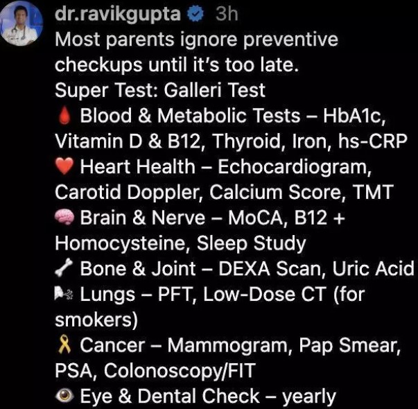 ನೀವು ಹೆತ್ತವರನ್ನು ಪ್ರೀತಿಸುತ್ತಿದ್ದರೆ, ಈ ಆರೋಗ್ಯ ಪರೀಕ್ಷೆಗಳನ್ನು ಮಾಡಿಸಿಕೊಳ್ಳಬೇಕು ಎಂದು ಡಾ. ರವಿ ಗುಪ್ತಾ ಹೇಳಿದ್ದಾರೆ.