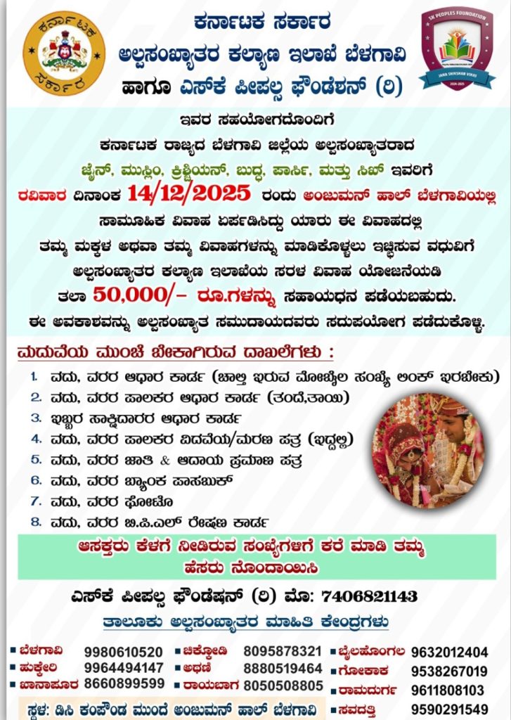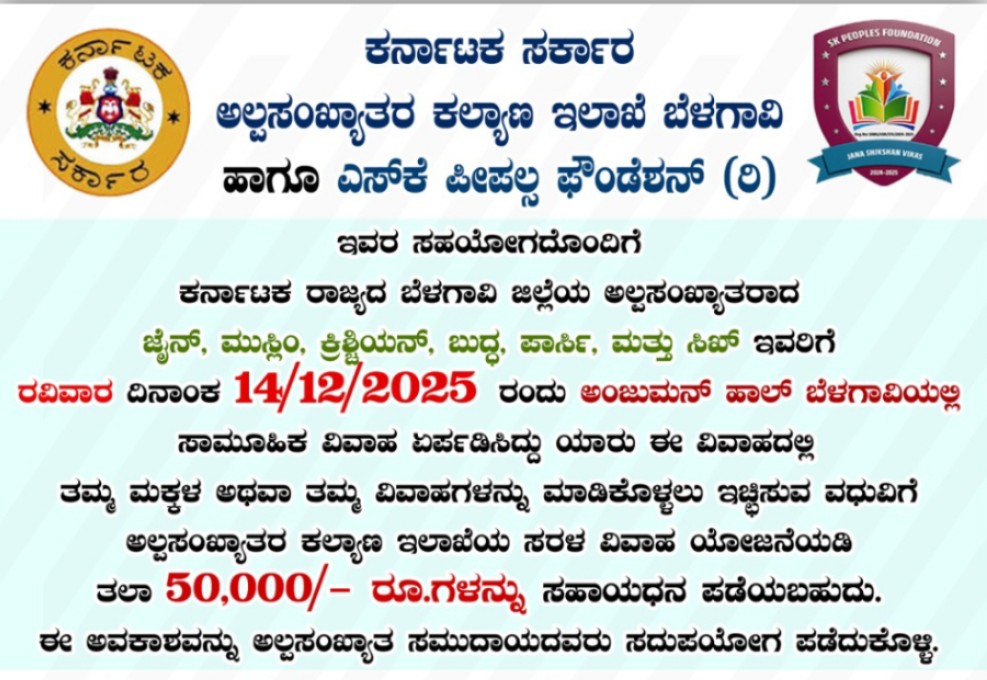 ಅಲ್ಪಸಂಖ್ಯಾತರ ಕಲ್ಯಾಣ ಇಲಾಖೆ ಬೆಳಗಾವಿ ಇವರ ವತಿಯಿಂದ ಸರಳ ವಿವಾಹವನ್ನು ದಿ:14-12-2025 ರಂದು ಅಂಜುಮನ ಹಾಲ್ ಬೆಳಗಾವಿ ಇಲ್ಲಿ ಇಟ್ಟುಕೊಳ್ಳಲಾಗಿದೆ. ಆದ್ದರಿಂದ ಬೆಳಗಾವಿ ಜಿಲ್ಲೆಯ ಎಲ್ಲಾ ಅಲ್ಪಸಂಖ್ಯಾತ ಸಮುದಾಯದ ಮುಸ್ಲಿಂ, ಜೈನ, ಕ್ರಿಶ್ಚಿಯನ್, ಸಿಖ್, ಬೌದ್ಧ ಹಾಗೂ ಪಾರ್ಸಿ ಜನಾಂಗದವರು ಇದರ ಸದುಪಯೋಗ ಪಡೆದುಕೊಳ್ಳಬೇಕೆಂದು ಈ ಮುಖಾಂತರ ಕೋರಲಾಗಿದೆ.